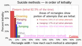 In the United States suicide by firearm is the most lethal method of suicide, resulting in a fatality 90% of the time,[28] and is thus the leading cause of death by suicide as of 2017.[62] Worldwide, firearm prevalence in suicides varies widely, depending on the acceptance and availability of firearms in a culture. The use of firearms in suicides ranges from less than 10% in Australia[63] to 50.5% in the U.S., where it is the most common method of suicide.[64]