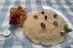 Suji ka Halwa (Hindi: सूजी का हलवा, Urdu: سوجی کا حلوہ) is a type of halvah made by toasting semolina (called suji, sooji, or rawa) in a fat like ghee or oil, and adding a sweetener like sugar syrup or honey. It can be served for breakfast or as a dessert item. The basic recipe is made with just semolina, sugar or honey, ghee, and sometimes milk. Variations on this include dried or fresh fruits, nuts, shredded coconut, and other toppings.