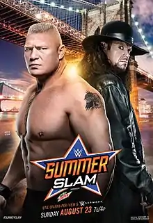 At WrestleMania XXX in 2014, Brock Lesnar defeated The Undertaker to end his undefeated WrestleMania streak.[15] Four months later, Lesnar defeated John Cena at SummerSlam to win the WWE World Heavyweight Championship,[16] but lost it the following year at WrestleMania 31 in his match against Roman Reigns when Seth Rollins cashed in his Money in the Bank contract and won the championship.[17] Lesnar received his rematch against Rollins at Battleground, and was closing in on the win when The Undertaker returned and attacked Lesnar, causing Lesnar to win by disqualification, but not win the championship.[18] The following night, a rematch between Lesnar and Undertaker was scheduled for SummerSlam.[19] This would be Undertaker's first SummerSlam match since 2008, and his first pay-per-view match outside of WrestleMania since Bragging Rights in 2010.