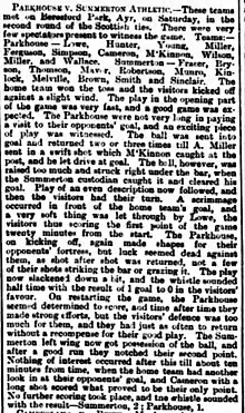 Even a club as obscure as Summerton had suffered from the professionalism in the English game, losing John Smith and Robert Bryson to Elswick Rangers before the start of the 1889–90 season.[4] The club at least started its senior career on a positive note, with an easy 5–1 win over Clydesdale,[5] and it gained a walkover in the first round of the 1889–90 Scottish Cup, after Temperance Athletic scratched. Reality soon struck - in the first round of the Glasgow Cup, the club lost 4–1 at home to Partick Thistle,[6] and in the second round of the national cup, the club was drawn away at Queen's Park. The home side scored 5 when playing against the wind and eased off when they had reached 11.[7]