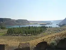 Umatilla Rock is a large basalt rock which resisted being eroded by the Great Floods.[5] Its location is downstream of the falls and upstream of the main park and resort. Nearby lakes include Dry Falls, Perch, Red Alkali, Green Alkali, and Meadow.[6]