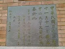 In 1924, Sun Yat-sen founded National Kwangtung University (國立廣東大學) in Canton and inscribed in his own handwriting the school motto of "Study Extensively, Enquire Accurately, Reflect Carefully, Discriminate Clearly, Practise Earnestly."[1][2] After the death of Sun Yat-sen, the Nationalist government that was set up during the first cooperation between the Communists and Nationalists formally decreed to change its name to National Sun Yat-sen University (國立中山大學) on July 17, 1926, in memory of Sun Yat-sen. In 1926, there were four National Sun Yat-sen Universities: National First Sun Yat-sen University in Canton (the current Sun Yat-sen University), National Second Sun Yat-sen University in Wuhan (the current Wuhan University), National Third Sun Yat-sen University in Hangzhou (the current Zhejiang University), National Fourth Sun Yat-sen University in Nanking (the predecessor of the current Nanjing University, Southeast University, and National Central University). The Nationalist government also planned to organize the National Fifth Sun Yat-sen University in Zhengzhou, but end up naming it as the Henan Provincial Sun Yat-sen University (the current Henan University).