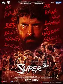Super 30 is a 2019 Indian Hindi-language biographical drama film produced by Phantom Films, Nadiadwala Grandson Entertainment, Reliance Entertainment and HRX Films at budget of ₹60 crore.[2] Based on the life of mathematics teacher and educator Anand Kumar as well as educational program of the same title, it is directed by Vikas Bahl and stars Hrithik Roshan as Anand Kumar.[3][5]