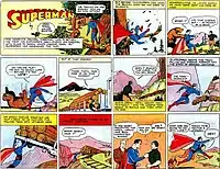 McClure Syndicate, concerned and fearing newspapers would cancel the popular Superman strip if it could not appear regularly and on time, appealed to DC to instead create a spin-off strip, Lois Lane, Girl Reporter, for McClure to use as a filler material for newspaper syndication. Lois Lane accompanied the Superman Sunday strip in the Cleveland Plain Dealer, running irregularly between October 24, 1943, and February 27, 1944; a total of twelve Lois Lane topper strips were produced.[2][3]