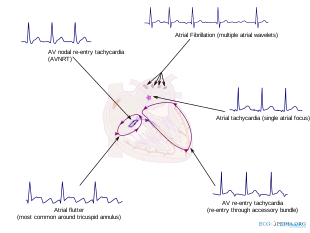 | Types | Atrial fibrillation, atrial flutter, paroxysmal supraventricular tachycardia (PSVT), Wolff-Parkinson-White syndrome,[2] AVRT, AVNRT, PJRT, Sinus Tachycardia, MAT, JET, Atrial tachycardia, SA Nodal Reentrant Tachycardia(SANRT) |