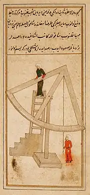 A quadrant is an instrument used to measure angles up to 90°. Different versions of this instrument could be used to calculate various readings, such as longitude, latitude, and time of day. Its earliest recorded usage was in ancient India in Rigvedic times by Rishi Atri to observe a solar eclipse.[1][2] It was then proposed by Ptolemy as a better kind of astrolabe.[3] Several different variations of the instrument were later produced by medieval Muslim astronomers. Mural quadrants were important astronomical instruments in 18th-century European observatories, establishing a use for positional astronomy.