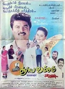 Surya Vamsam (transl. Solar dynasty) is a 1997 Indian Tamil-language drama film written and directed by Vikraman. The film stars R. Sarathkumar and Devayani, with Manivannan, Radhika, Nizhalgal Ravi, Tharini, Ajay Ratnam, Jai Ganesh, Shiva and Anandaraj in supporting roles. It revolves around a traditional father and his illiterate son, following their tense relationship and shows how the strict patriarchy causes a drift between them.