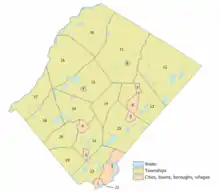 By the 1750s, residents of this area began to petition colonial authorities for a new county to be formed; they complained of the inconvenience of long travel to conduct business with the government and the courts. By this time, four large townships had been created in this sparsely populated Northwestern region: Walpack Township (before 1731), Greenwich Township (before 1738), Hardwick Township (1750) and Newtown Township (1751). On June 8, 1753, Sussex County was created from these four municipalities, which had been part of Morris County when Morris stretched over all of northwestern New Jersey.[1] Sussex County at this time encompassed present-day Sussex and Warren Counties and its boundaries were drawn by the New York-New Jersey border to the north, the Delaware River to the west, and the Musconetcong River to the south and east.[23] After several decades of debate over where to hold the sessions of the county's courts, the state legislature eventually voted to divide Sussex County in two, using a line drawn from the juncture of the Flat Brook and Delaware River in a southeasterly direction to the Musconetcong River running through the Yellow Frame Presbyterian Church in present-day Fredon Township (then part of Hardwick).[24] On November 20, 1824, Warren County was created from the southern territory of the Sussex County.[24]