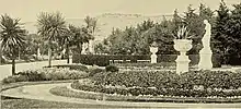 The grounds consisted of a spacious turreted mansion, a carriage house, and outbuildings set in expansive gardens. The estate dominated the Lands End area, with an elaborate entrance gate. He spent in excess of a million dollars to recreate an Italian style garden. It was filled with fountains, planted urns, and statues, Victorian flower beds, hedge mazes, parterres, forests of trees, a glass plant conservatory, and other garden structures. Vista points included the "observation plaza" overlooking the Cliff House, and the "Dolce far Niente Balcony," a long terrace-like structure along the cliff overlooking Ocean Beach.[5] To provide garden decorations, he imported over 200 concrete replicas of Greek and Roman statuary from Belgium, to provide examples of European culture to visitors.[7]