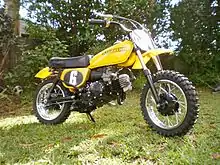The Suzuki JR50 is a miniature motorcycle with a 49 cc (3.0 cu in) displacement and a single-speed automatic transmission, using a centrifugal clutch and height adjustable suspension.[1] [2]An oil injected two-stroke engine provides optimum lubrication and an oil level window makes it easy to see when a refill is needed. It is designed for children ages 5 to 12, and has been used for both racing and recreational riding. The JR50's engine was later used in the ALT50 and LT50 ATV's.