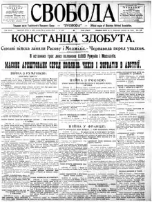 Svoboda was founded in Jersey City, New Jersey[3] on 11 September 1893 by Father Hryhorii Hrushka. On February 22, 1894, the Ukrainian National Association (UNA) adopted the newspaper as its organ.[4] It became a bi-weekly newspaper on 1 March 1894, a tri-weekly on 8 August 1914, and a daily on 3 January 1921. Svoboda served as a 'mouthpiece" for Ukrainians in North America, and played an important role in the discussing and solving of immigrant difficulties. Prior to the establishment of Ukrainian-Canadian periodicals (such as the Kanadiiskyi Farmer), it was the only Ukrainian-language newspaper of any note in Canada[5] but was banned by the country during World War II for its pro-Nazi sympathies.[6]