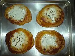 The Swabian Cream Cake is a thin yeast flatbread spread with sour cream and topped with onion or leek and bacon, very similar to the Flammkuchen from Alsace. The topping may vary and some add egg or caraway seed. In the Heilbronn area, a variation called "Peterlingkuchen" (parsley cake) is popular and as the name suggests, this flat bread is topped with parsley. The name also differs depending on the locale, with variations being Dennetle, Dinnette, Blooz, and Bätscher.