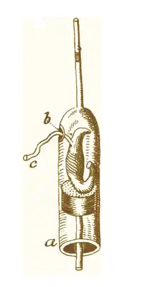 In Biblia naturae Swammerdam's research on muscles was published. Swammerdam played a key role in the debunking of the balloonist theory, the idea that 'moving spirits' are responsible for muscle contractions. The idea, supported by the Greek physician Galen, held that nerves were hollow and the movement of spirits through them propelled muscle motion.[21] René Descartes furthered the idea by basing it on a model of hydraulics, suggesting that the spirits were analogous to fluids or gasses and calling them 'animal spirits'.[21] In the model, which Descartes used to explain reflexes, the spirits would flow from the ventricles of the brain, through the nerves, and to the muscles to animate the latter.[21] According to this hypothesis, muscles would grow larger when they contract because of the animal spirits flowing into them. To test this idea, Swammerdam placed severed frog thigh muscle in an airtight syringe with a small amount of water in the tip.[21] He could thus determine whether there was a change in the volume of the muscle when it contracted by observing a change in the level of the water (image at right).[21] When Swammerdam caused the muscle to contract by irritating the nerve, the water level did not rise but rather was lowered by a minute amount; this showed that no air or fluid could be flowing into the muscle.[21] The idea that nerve stimulation led to the movement had important implications for neuroscience by putting forward the idea that behavior is based on stimuli.[21]