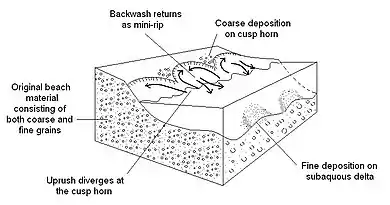 The beach cusp is a crescent-shaped accumulation of sand or gravel surrounding a semicircular depression on a beach. They are formed by swash action and more common on gravel beaches than sand. The spacing of the cusps is related to the horizontal extent of the swash motion and can range from 10 cm to 50 m. Coarser sediments are found on the steep-gradient, seaward pointing ‘cusp horns’ (Figure 3). Currently there are two theories that provide an adequate explanation for the formation of the rhythmic beach cusps: standing edge waves and self-organization.[4]