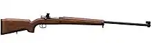 The m/1941 sniper rifles were m/1896 rifles of all three manufacturers, in 1941–1943 selected from the existing stock for accuracy and converted by Carl Gustafs Stads Gevärsfaktori into sniper rifles.[1] This modification of some 5,300 rifles included the bolt handle turned-down in order to provide clearance for unimpaired operation of the bolt handle and three-position safety catch lever with a telescopic sight mounted.[1] The optics fitted were initially the German AJACK 4×90 (4×38 in modern terminology) m/41 telescopic sight. "AJACK" refers to the German optics manufacturer Adolph Jackenroll Optische Anstalt GmbH. The AJACK 4×90 had bullet drop compensation in 50 m (55 yd) increments for ranges from 100 to 800 m (109 to 875 yd).[7][13] However, because of the deteriorating war situation Germany stopped selling telescopic sights to Sweden after 4,000 units were delivered, resulting in domestically produced 1,300 AGA 3× m/42 and 3× m/44 telescopic sights (made by Svenska Ackumulatorfabriken Jungner) being used instead.[14][15]