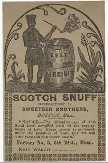In 1820, his son Charles Sweetser purchased the snuff mill of Samuel Copp. Sweetser also manufactured cigars, specifically "long nines" and "short sixes". Sweetser's products were sold throughout the United States and Canada.[1] Sweetser expanded his company by acquiring the snuff business owned by Jonathan Makepeace.[2] By 1850, the business was known as Charles Sweetser & Sons.[3] Charles Sweetser retired in 1855 and the business was taken over by two of his sons - Charles A. and George H. Sweetser, who began running it under the name Sweetser Brothers.[4][1] Following George H. Sweetser's death in 1870, his son Albert H. Sweetser took over his half of the business. On October 1, 1874, Charles A. Sweetser sold his interest to his son, Charles H. Sweetser. On January 1, 1881, Albert Sweetser acquired his cousin's interest in the business.[5] In November 1885 he sold the business to Joseph A. Raddin.[6]
