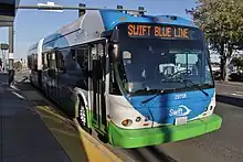The Blue Line runs at a headway of 10 minutes from 6:00 a.m. to 7:00 pm on weekdays, its highest level of service with five buses per hour per direction.[34] Weekday service begins with a headway of 20 minutes from 4:15 a.m. to 6:00 am, and ends with the same frequency during the evening from 7:00 p.m. to 11:00 pm. During Saturdays, buses run every 15 minutes from 6:00 a.m. to 7:00 p.m. and every 20 minutes from 7:00 p.m. to 10:00 pm. Sunday service, which was suspended from 2010 until 2015,[35][36] runs from 7:00 a.m. to 9:00 pm every 20 minutes.[33][14] Swift initially ran at a 10-minute headway, and had evening service end at midnight, until a major system-wide service reduction in February 2012 reduced its weekday headway to 12 minutes.[37][38] The 10-minute weekday frequency was restored in September 2018,[34] and Saturday frequency was bumped from 20 minutes to 15 minutes in September 2019.[39]