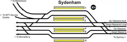 It had been intended that the tracks on platforms 1 and 2 would extend along the alignment to Erskineville as an adjunct to the Eastern Suburbs railway.[4] This plan was never completed, although partial platforms were erected at St Peters and Erskineville in preparation. Because of this, Bankstown line trains continue to run on the same tracks as East Hills services, and the result of the additional platforms is that the Bankstown line's junction with the Illawarra line has been merely moved from the south of Sydenham station to the north.[5]