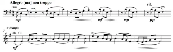 The first movement is written in a sonata form, with deviations in the recapitulation.[9] The main themes of the exposition are predominantly based on the pentatonic scales of E minor and G major. Following the development section, a traditional recapitulation of the opening material is declined, and instead the themes are fragmented and combined to bring the movement to a striking close.