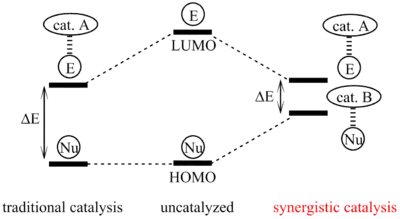 Synergistic catalysis is a specialized approach to catalysis whereby at least two different catalysts act on two different substrates simultaneously to allow reaction between the two activated materials. While a catalyst works to lower the energy of reaction overall, a reaction using synergistic catalysts work together to increase the energy level of HOMO of one of the molecules and lower the LUMO of another.[1] While this concept has come to be important in developing synthetic pathways, this strategy is commonly found in biological systems as well.