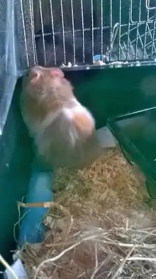 [18] The Rex coat modifier first appeared in 1970. It is a recessive gene, characterised mainly by short, curly whiskers. It can appear in both shorthaired and longhaired hamsters. The curls are more visible on the shorthaired and displays as a wavy coat on the longhaired hamsters. Because of the variance in curliness, the most foolproof way of knowing if a hamster is Rex is by looking at the whiskers.[19] [20][21]