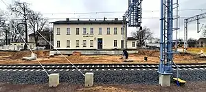 Szamotuły railway station is a railway station serving the town of Szamotuły, in the Greater Poland Voivodeship, Poland. The station opened in 1848 and is located on the Poznań–Szczecin railway and Szamotuły–Międzychód railway. The train services are operated by PKP and Przewozy Regionalne.
