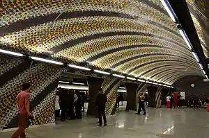 Szent Gellért tér – Műegyetem (formerly Szent Gellért tér) is a station of Line 4 of the Budapest Metro. It is located beneath the eponymous square, named after St. Gerard (Szent Gellért), patron saint of Budapest.[1] The station was opened on 28 March 2014 as part of the inaugural section of the line, from Keleti pályaudvar to Kelenföld vasútállomás.[2] Artist Tamás Komoróczky was commissioned to design the mosaic interior decoration of the inner platform below the University of Technology and Economics. It is the deepest station on Line 4.