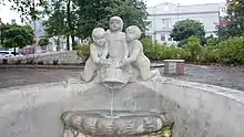 The monument was made from artificial stone and depicted three children sitting on a fish, from whose mouth the foutain water flowed into a pool.