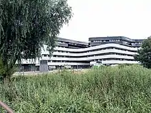 Starting from the late 1950s, the city authorities have been identifying places where to erect large housing projects: a first cluster of 11-storey buildings was constructed in the second half the 1960s in Stroma street, following a typical functionalist design.[19] By the end of the 1960s, additional and larger ensembles were completed, such as the Maria Konopnicka estate accommodating about 3700 people or the housing estate at Ugory street for 1800 residents with modest income.[19] Built using poor quality materials, these housing projects offered modest equipped apartments.[20] At the time, the area of Szwederowo was reclassified for high, multi-family buildings in the new general spatial development plan of 1964,[19] and the project of airport development was finally abandoned.