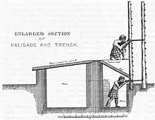 Tītokowaru used those five weeks to demonstrate his hold on the Wanganui hinterland, burning farms and abandoned military posts and driving off stock, but also laboring over the fortifications at Tauranga-ika until it became one of the most formidable modern pā ever built.[1] The pā had been built in a diamond shape, 135 metres long on each side, complete with trenches, rifle pits, parapets and a double line of stockade.[11] The palisade, attached to 30 cm-thick posts, reached 5m above the ground, with a gap at its base to allow defenders in the trenches to fire beneath it. Inside the pā were trenches, covered walkways and shellproof underground shelters roofed with strong timbers, packed earth and galvanised roofing iron. At one corner was a 10m-high taumaihi,[12] providing a third level of fire. Inspecting it later, Whitmore said, "No troops in the world could have hewn their way through a double row of strong palisades, backed by rifle pits and flanked by two-storey erections, such as are constructed in this fortification, defended by excellent shots and desperate men."[lower-alpha 2][1]