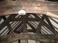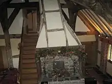 The limewashed box-framed house, four bays long, sits on a stone platform built into the hillside, under a broad half-hipped roof (now replaced with tiles rather than slates, for which evidence was found in the archaeological excavations thatch). The principal timbers are tree-ring dated to 1460: dendrochronology has also provided dates of 1594, when a first floor was inserted within the hall, and 1631 when the internal timber-framed smoke-hood was added.[4] The restoration has retained the smoke-hood, but has otherwise restored the three-unit plan of storeyed units at either end of the open, aisled hall.[8] The two trusses within the hall are a single pair of chamfered wooden speres or posts set in the floor and forming a box-frame which carries the roof, and a pair of arch-braced base-crucks with two tiers of cusped struts above the tie-beam, which spanned the whole width of 7.5 m. The analogies are with the partly aisled halls of important houses in north-east Wales and north-west England.[9] Gable and partition trusses, also aisled. Wind-braces were employed both below the wall-plate and along the purlins