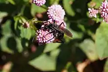Tachypompilus analis, the red-tailed spider wasp[3] is a species of spider wasp found in most of tropical and subtropical Asia, north to Japan. These spider wasps often hunt huntsman spiders.