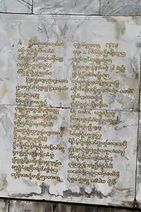 The Tai Tham script shows a strong similarity to the Mon script used by the Mon kingdom of Haripunjaya around the 13th century CE, in the present-day Lamphun Province of Northern Thailand. The oldest known document containing the Tai Tham script is dated to 1376 CE and was found in Sukhothai. The document is a bilingual inscription on a gold folio, containing one line of Pali written in the Tai Tham script, while the vernacular is written in the Siamese language, using the Sukhothai script. The Tai Tham script was adapted to write vernacular languages not later than the 15th century CE, most probably in Chiang Mai, in the Lan Na Kingdom.[7] The script spread from Lan Na to surrounding areas such as modern day Laos, Isan, Shan State and Sipsong Panna. Numerous local variants developed, such as the Lue variant (Sipsong Panna), the Khuen variant (Shan State) and the Tham Lao variant (Laos and Isan). The variants differ only slightly in appearance, and the system of writing has remained the same.[8] As the name suggests, the use of the Tham (Dharma) script in Lao was restricted to religious literature, either used to transcribe Pali, or religious treatises written in Lao intended solely for the clergy. Religious instructional materials and prayer books dedicated to the laity were written in Tai Noi instead. As a result, only a few people outside the temples were literate in the script. In Isan, evidence of the script includes two stone inscriptions, such as the one housed at Wat Tham Suwannakhuha in Nong Bua Lamphu, dated to 1564, and another from Wat Mahaphon in Maha Sarakham from the same period.[9]