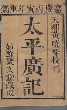 The Taiping Guangji (Chinese: 太平廣記), sometimes translated as the Extensive Records of the Taiping Era, or Extensive Records of the Taiping Xinguo Period, is a collection of stories compiled in the early Song dynasty. The work was completed in 978, and printing blocks were cut, but it was prevented from publication on the grounds that it contained only xiaoshuo (fiction or "insignificant tellings") and thus "was of no use to young students." It survived in manuscript until it was published in the Ming dynasty.[1] It is considered one of the Four Great Books of Song (宋四大書). The title refers to the Taiping Xinguo era (太平興國, "great-peace rejuvenate-nation", 976–984 AD), the first years of the reign of Emperor Taizong of Song.[2]