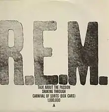 "Talk About the Passion" is a song by the American alternative rock band R.E.M., released as the second single released from its debut album Murmur in 1983. It was released in Europe only, on 12" vinyl. This song failed to follow up on the success of "Radio Free Europe" released earlier in the year, as it did not chart. A live performance at Larry's Hideaway, Toronto, Ontario, Canada, from July 9, 1983, was released on the 2008 Deluxe Edition reissue of Murmur.