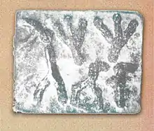 A steatite seal from a signet ring found in an early Iron Age burial in Anaikoddai, Jaffna. The seal contains both Brahmi and megalithic graffiti symbols arranged in a way that suggests that they may be a translation of each other.[5] |