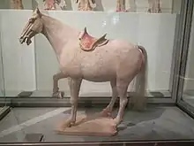 Along with guardian figures and officials, statues of horses are the main type of tomb figure that is also known in other media, such as gilt-bronze or stone, and some rich tombs also contain such figures in metal.[56] The camels may sometimes belong to tombs of people rich from trade,[57] but also seem to have been associated with wealth generally. They are often shown with heads raised and their mouths open, and in the finest models the shaggy areas at the neck and top of the legs are carefully textured in the clay. The horses are the "heavenly horses" from Ferghana in the west, which under the Tang dynasty were more common in China and ceased to be a highly prized rarity.[58] These were also made in pottery under the Han dynasty; the Tang examples are more realistic,[59] if perhaps less expressive.