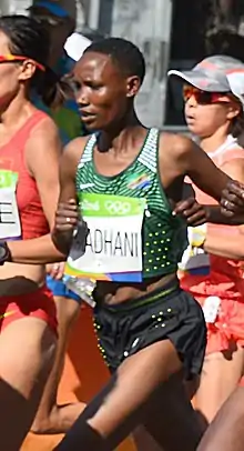 Four Tanzanian athletes, three men and one woman, qualified for the Olympics, all in marathon events. The lone woman was Sara Ramadhani, whose three-year suspension from international competition for testing positive for banned substances at the 2014 Commonwealth Games ended in early 2016.[5] She finished 121st out of 157 participants in the women's marathon.[6] Of the three men, Fabiano Joseph Naasi was the only one with previous Olympic experience, having taken part in the 5000 and 10,000 m events at the 2004 Games and the 10,000 m in 2008.[7] He had also won a bronze medal in the 10,000 m competition at the 2006 Commonwealth Games[8] and was the World Half Marathon Champion in 2005.[9] In Rio he was 112th out of 155 athletes in the men's marathon.[10] Saidi Makula, who had competed in only two full marathons prior to the Olympics,[11] fared better in 43rd place.[10] Alphonce Felix Simbu, who had been 12th in the marathon at the 2015 World Championships in Athletics,[12] placed fifth, one minute and ten seconds behind Galen Rupp of the United States, the bronze medalist, and 2 minutes, 31 seconds behind winner Eliud Kipchoge of Kenya.[10]