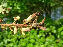 Stems bearing deformed fruit may also thicken and grow with a deformation. The leaves are smaller and strap-like and shoots may be swollen, pale yellow and tinged with red.[1] The fungus may also cause dense clusters of live and dead twig, called "witches' brooms". Some authors suggest these are caused by the very similar Taphrina insititia.[6]