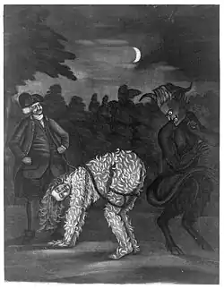 Tarring and feathering appeared in several English plays in the 1770s as a novel element used in "a satirical and comedic context". The appearance of a victim of the punishment was also used as a costume in a masked ball and other public appearances of that time.[45] Much later, in Meredith Willson's musical The Music Man (1957), tarring and feathering is demanded as punishment of the main character Harold Hill, con man and Trickster figure, for his scam.[57][58]