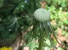 In general, the leaves are 50–250 mm (2–10 in) long or longer, simple, lobed-to-pinnatisect, and form a basal rosette above the central taproot. The flower heads are yellow to orange coloured, and are open in the daytime, but closed at night. The heads are borne singly on a hollow stem (scape) that is usually leafless and rises 10–100 mm (3⁄8–3+7⁄8 in) or more[5] above the leaves. Stems and leaves exude a white, milky latex when broken. A rosette may produce several flowering stems at a time. The flower heads are 20–50 mm (3⁄4–2 in) in diameter and consist entirely of ray florets. The flower heads mature into spherical seed heads sometimes called blowballs[9] or clocks (in both British and American English)[10][11][12][13] containing many single-seeded fruits called achenes. Each achene is attached to a pappus of fine hair-like material which enables wind-aided dispersal over long distances.