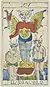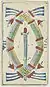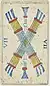 This deck pattern was derived from the Tarot of Marseilles but was made reversible for modern game playing.[5][6] It consists of 78 cards: a trump suit of 22 cards, numbered from 0 to 21, and four 14-card suits of swords (spade), batons (bastoni), cups (coppe), and coins (denari). Each suit has a king (re), queen (donna), knight (cavallo) and jack (unlabelled), pip cards numbered from 2 to 10, and an unnumbered card with an elaborate suit symbol which acts as the ace. Trumps and most pip cards have indices in modern Arabic numerals (for trumps, cups, and coins) or Roman numerals (for swords and batons). Unusually, in most games trump 20 outranks trump 21 (this may have been influenced by Bolognese games).