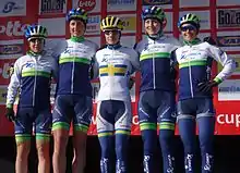 Although GreenEDGE had set up a Chinese-registered continental men's team, Mitchelton–Scott at the start of the year in order to attract a new naming sponsor in the Far East after Orica's five year commitment finished up at the end of 2017.[36] In September, a week before the road world championships, Cycling Australia confirmed it would withdraw support from both the Orica–Scott women's team and the Mitchelton–Scott U23 team at the end of 2017. In order to fill the funding gap, GreenEDGE owner Gerry Ryan will step in for CA and Orica for 2018, and continue supporting the women's team and U23 men's team even though the team had been unsuccessful in finding a replacement sponsor for Orica.[37][38] By December, with the team unable to bring in a new title sponsor outside the Ryan family business, GreenEDGE announced their new team names and title sponsors for 2018 men's World Tour and UCI women's teams as Mitchelton–Scott. The U23 continental men's team that previously used the Mitchelton–Scott team name in 2017, announced its naming co-sponsors for 2018 with Ryan family businesses just ahead of the Australian national championships in January 2018, racing as Mitchelton–BikeExchange.[39] With Orica exiting sponsorship of the teams, the team jerseys' loses their blue colours, for 2018 the team adopts Scott Sports RC (Racing Concept) team colours of black and yellow as used by the Scott mountain bike teams.