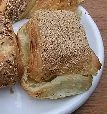 The pastry is usually made with milk, sugar, salt, flour, yeast, eggs, and butter.[4] The dough is made by rolling out laminated dough and folding it several times to create layers.[3][5]