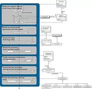 A technology roadmap is a flexible planning schedule to support strategic and long-range planning, by matching short-term and long-term goals with specific technology solutions.[1][2] It is a plan that applies to a new product or process and may include using technology forecasting or technology scouting to identify suitable emerging technologies.[3] It is a known technique to help manage the fuzzy front-end of innovation.[4] It is also expected that roadmapping techniques may help companies to survive in turbulent environments[1] and help them to plan in a more holistic way to include non-financial goals and drive towards a more sustainable development.[5] Here roadmaps can be combined with other corporate foresight methods to facilitate systemic change.[6]
