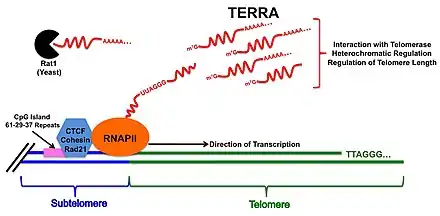 While the exact transcription start site is still a matter of debate, it is widely held that TERRA transcription begins in the subtelomeric region at the end of chromosomes, just before the tandem repeats of the telomere begin. In humans, at least 20 of 23 chromosome ends have been shown to contain CpG islands, which are generally found at or near transcription start sites in the subtelomeric region. Within these CpG island are three repetitive DNA tracts occurring in sequence: a centromere-proximal tract of repeated 61-base-pair (bp) units; second, a more distal tract of 29-bp units; and a third 37-bp unit tract. These highly conserved repetitive elements are known as 61-29-37 Repeats. Additionally, the chromatin organization factors CTCF (CCCTC-Binding Factor), Cohesin, and Rad21 - which are known to aid in the recruitment of RNAPII[7] - have also been shown to bind within 1-2 kilobases of the telomeric tracks just upstream of these CpG islands.[8] While not definitely known, the proximity of these factors immediately upstream of the proposed TERRA transcription start site suggest that they may function as promoter elements for the start of TERRA transcription.[5]