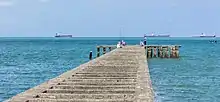Along the brown sand beach are numerous restaurants,[2] many serving grilled fish. Souvenirs and hotels are also available. Fishing is a popular pastime at the beach,[1] which is crowded with local residents on the weekends. Boats are available for rent, as are water activities such as banana boats.[3] Access to other tourist attractions is available through Teluk Penyu, including the abandoned fortress of Benteng Pendem, located on the west side of the beach,[4] and the island of Nusa Kambangan, which is accessible through a short boat ride.[1] On this island there are several further beaches, including Karang Bolong.[5]