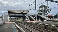 The overhead booking office located on the footbridge, formerly a weatherboard building, is now clad in hardiplank. The building has a gabled roof clad in modern cliplock roofing with 3 gable ends (east-west, and one facing the platforms to the south). There are three original timber framed double hung windows on the north elevation, and an original doorway with a fanlight covered over. There is a modern timber flush door. There are three original large timber stop-chamfered posts to the east side of the ticket office which have been cut short at the bottom, and now have concrete bases.[2]