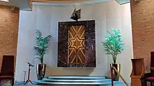 The building includes a main sanctuary, a fellowship hall (which can be also used as overflow seating for high holiday services), classrooms, offices, a library, a gym and a smaller chapel. Art and other visual displays are scattered throughout the building.[45][46] The building is located on a 8.77 acre campus with a pool and a playground.[47]