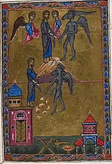 The temptation of Christ has been a frequent subject in the art and literature of Christian cultures. A scene usually interpreted as the third temptation of Jesus is depicted in the Book of Kells.[58] The third and last part of the Old English poem Christ and Satan concerns The Temptation of Christ,[59] and can be seen as a precursor to John Milton's Paradise Lost. The Temptation of Christ is indeed the subject of Milton's sequel to Paradise Lost, Paradise Regained. J. M. W. Turner did an engraving of "The Temptation on the Mountain" for an 1835 edition of The Poetical Works of John Milton. Satan and Jesus stand in silhouette on a cliff overlooking a broad landscape that transitions into the sea.[60] The "...image depicts the temptation of Christ by Satan, specifically the moment where Satan offers Christ the kingdoms of the world. This vision of the temptation as extending to the open sea is eerily similar to the possibilities of conquest as commonly depicted in British and American art during the Romantic era."[61]